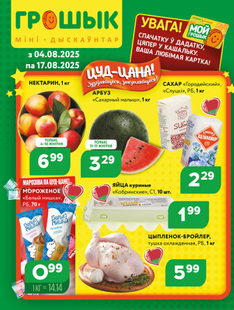 Текущие и будущие каталоги акций "Акционная листовка для дискаунтера «Грошык Міні» (4 - 17 Августа 2025)" супермаркетов Грошык Бобруйска