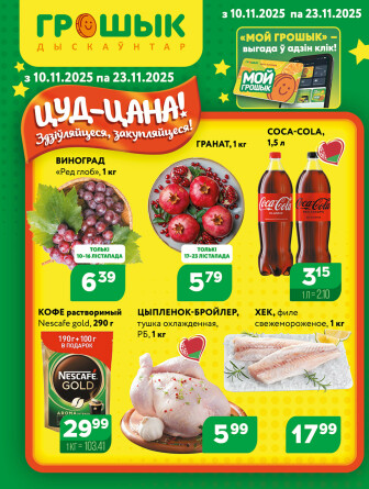Текущие и будущие каталоги акций "Акционная листовка для дискаунтера «Грошык Міні» (10 - 23 Ноября 2025)" супермаркетов Грошык Борисова