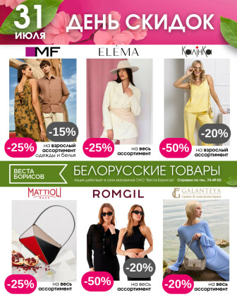 Специально для Вас, и для Вашего удобства, мы сгруппировали максимальное количество актуальных, а главное акционных предложений от супермаркетов Беларуси. На данной странице Вы сможете ознакомиться с акцией "День скидок!", которая проводится супермаркетом Веста Борисов
