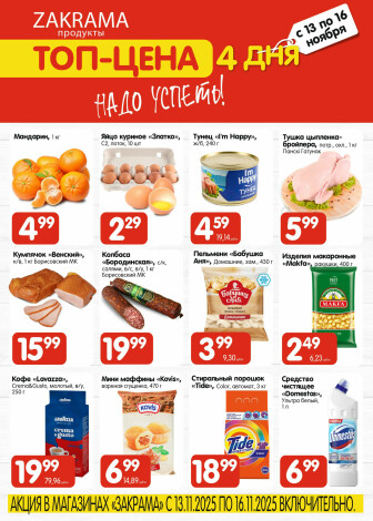 Специально для Вас, и для Вашего удобства, мы сгруппировали максимальное количество актуальных, а главное акционных предложений от супермаркетов Беларуси. На данной странице Вы сможете ознакомиться с акцией "ТОП - цена", которая проводится супермаркетом Zakrama