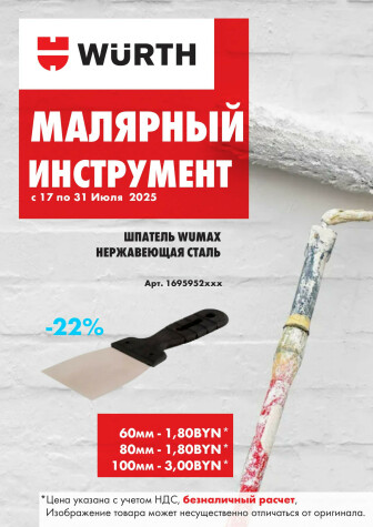 Специально для Вас, и для Вашего удобства, мы сгруппировали максимальное количество актуальных, а главное акционных предложений от супермаркетов Беларуси. На данной странице Вы сможете ознакомиться с акцией "Акция - Малярный инструмент!(Производится обслуживание только юридических лиц по безналичному расчету)", которая проводится супермаркетом ВюртБел
