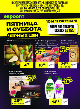 Текущие и будущие каталоги акций "Черные цены! (для супермаркетов) (10 - 11 Октября 2025)" супермаркетов Евроопт Минска