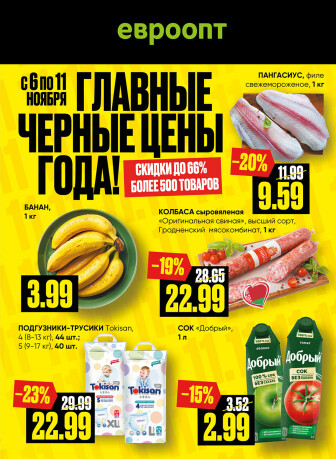 Специально для Вас, и для Вашего удобства, мы сгруппировали максимальное количество актуальных, а главное акционных предложений от супермаркетов Беларуси. На данной странице Вы сможете ознакомиться с акцией "Главные черные цены года! (для супермаркетов)", которая проводится супермаркетом Евроопт