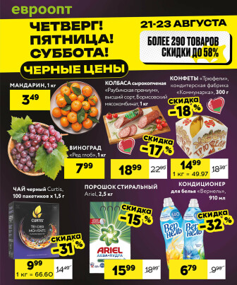 Специально для Вас, и для Вашего удобства, мы сгруппировали максимальное количество актуальных, а главное акционных предложений от супермаркетов Беларуси. На данной странице Вы сможете ознакомиться с акцией "Черные цены! (для супермаркетов)", которая проводится супермаркетом Евроопт