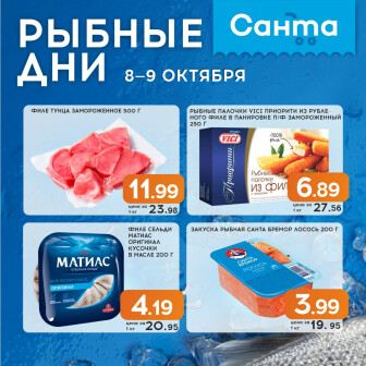 Текущие и будущие каталоги акций "Рыбные дни! (8 - 9 Октября 2025)" супермаркетов Санта Пинска