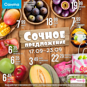 Текущие и будущие каталоги акций "Сочное предложение! (17 - 23 Сентября 2025)" супермаркетов Санта Речицы