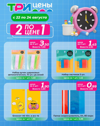 Специально для Вас, и для Вашего удобства, мы сгруппировали максимальное количество актуальных, а главное акционных предложений от супермаркетов Беларуси. На данной странице Вы сможете ознакомиться с акцией "2 по цене 1 на канцелярские товары", которая проводится супермаркетом Три цены