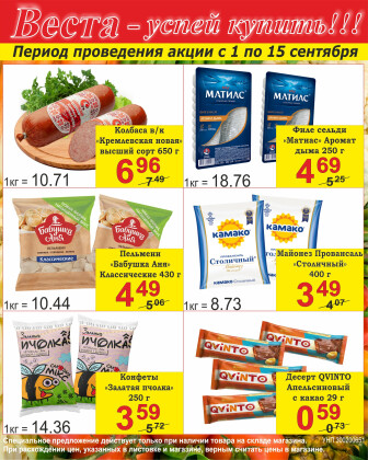 Текущие и будущие каталоги акций "Успей купить! (1 - 15 Сентября 2025)" супермаркетов Веста Светлогорска