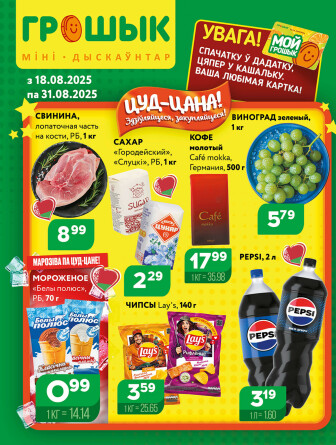 Текущие и будущие каталоги акций "Акционная листовка для дискаунтера «Грошык Міні» (18 - 31 Августа 2025)" супермаркетов Грошык Жлобина