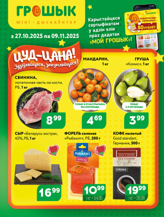 Текущие и будущие каталоги акций "Акционная листовка для дискаунтера «Грошык Міні» (27 Октября - 9 Ноября 2025)" супермаркетов Грошык Жлобина
