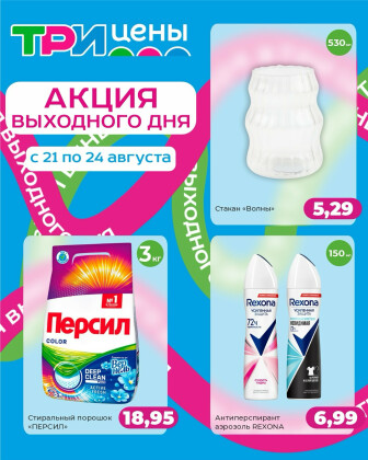 Специально для Вас, и для Вашего удобства, мы сгруппировали максимальное количество актуальных, а главное акционных предложений от супермаркетов Беларуси. На данной странице Вы сможете ознакомиться с акцией "Акция выходного дня!", которая проводится супермаркетом Три цены