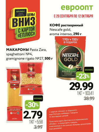 Текущие и будущие каталоги акций "Цены вниз! (С картой "Еплюс") (29 Сентября - 12 Октября 2025)" супермаркетов Евроопт Бобруйска