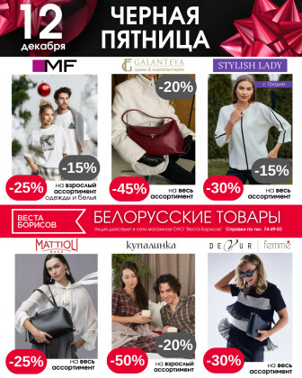 Специально для Вас, и для Вашего удобства, мы сгруппировали максимальное количество актуальных, а главное акционных предложений от супермаркетов Беларуси. На данной странице Вы сможете ознакомиться с акцией "Чёрная пятница!", которая проводится супермаркетом Веста Борисов