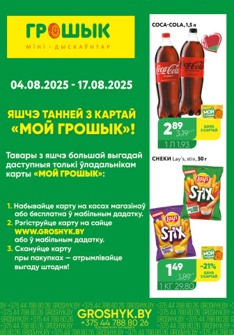 Текущие и будущие каталоги акций "Цуд-Цана для дискаунтера «Грошык Міні» (4 - 17 Августа 2025)" супермаркетов Грошык Гомеля