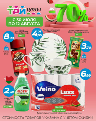 Текущие и будущие каталоги акций "Горячие цены! (30 Июля - 12 Августа 2025)" супермаркетов Три цены Кобрина