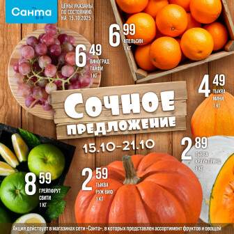 Текущие и будущие каталоги акций "Сочное предложение! (15 - 21 Октября 2025)" супермаркетов Санта Красносельского