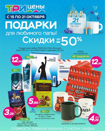 Специально для Вас, и для Вашего удобства, мы сгруппировали максимальное количество актуальных, а главное акционных предложений от супермаркетов Беларуси. На данной странице Вы сможете ознакомиться с акцией "Готовим подарки ко Дню отца", которая проводится супермаркетом Три цены