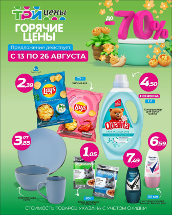 Текущие и будущие каталоги акций "Горячие цены! (13 - 26 Августа 2025)" супермаркетов Три цены Речицы