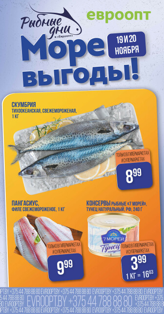 Специально для Вас, и для Вашего удобства, мы сгруппировали максимальное количество актуальных, а главное акционных предложений от супермаркетов Беларуси. На данной странице Вы сможете ознакомиться с акцией "Рыбные дни! (предложение только для гипермаркетов и супермаркетов)", которая проводится супермаркетом Евроопт